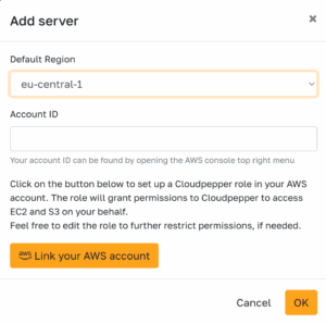 Click Link your AWS account. This opens the AWS console and starts a CloudFormation stack to create a role for Cloudpepper with the minimal permissions needed to create and manage servers on your behalf. You can edit the role later if you need to restrict permissions further.