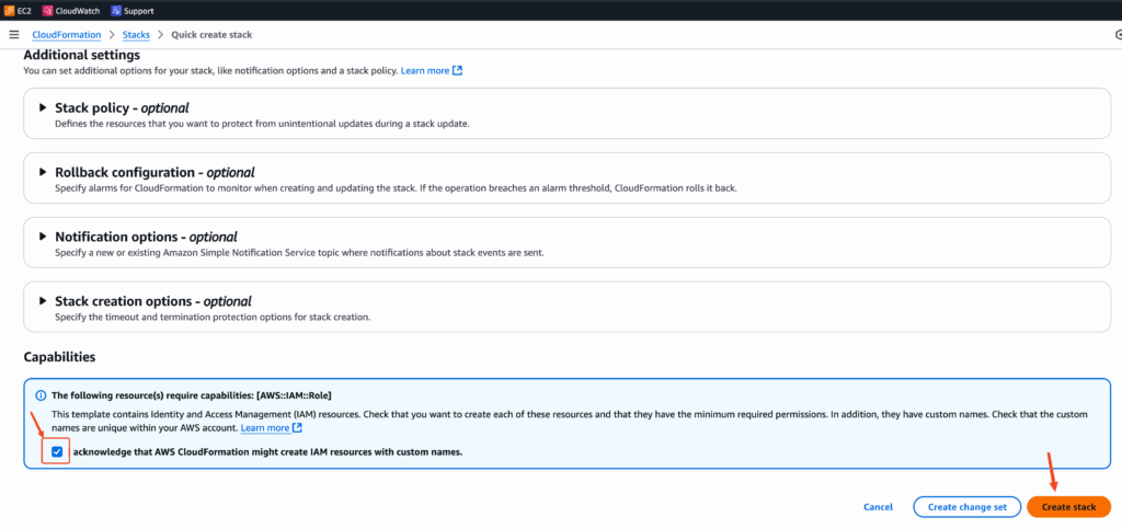 Scroll down the AWS page to acknowledge and Create stack.
