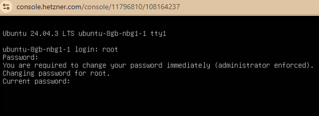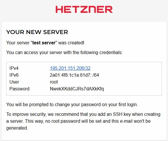 After a few minutes, you’ll receive an email from Hetzner with the root login details of your server (including a temporary password).